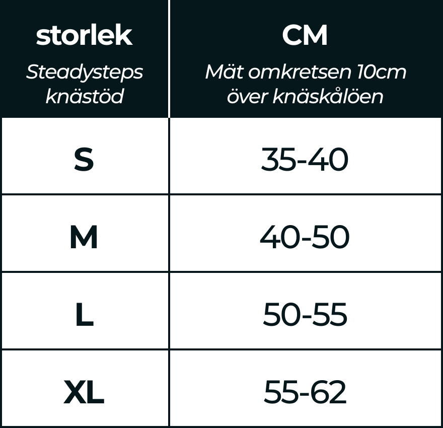 Nej, stödet är designat för att sitta stadigt hela dagen. Det är gjort i ett elastiskt material som formar sig efter benet och håller sin plats även när du rör dig. Rätt storlek är viktigt – därför erbjuder vi flera storlekar och tydlig storleksguide.
